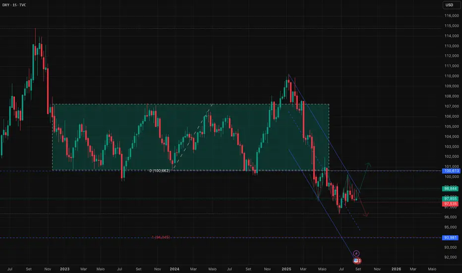 • Bullish case: reação em cima dos 97–98 + dados fortes dos EUA → alvo em 100,60.