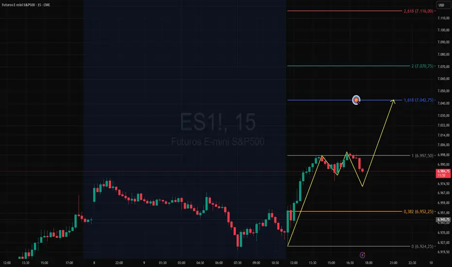 No gráfico de 5 minutos do ES1!, rompeu um pivô de alta indicando a busca do(s) alvo(s) da projeção de Fibonacci, poderá retrair gerando um trade com retorno/risco mais favorável.