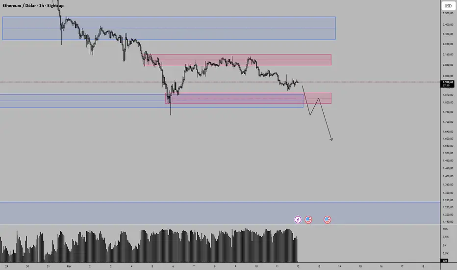 Caso rompa a primeira barra do dia 5 de fevereiro de 2026, referenciado pelo retângulo vermelho, estará rompendo também a primeira barra do mês de maio de 2025, referenciado pelo retângulo azul, abrindo espaço então para buscar a primeira barra do mês de Julho de 2022 também referenciado pelo retângulo azul e a partir de então abrir uma possibilidade de compra muito interessante... Por enquanto sigo fortemente vendedor!.