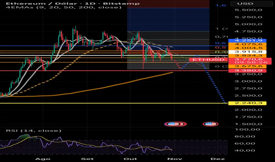 O Ethereum perdeu o suporte dos US$ 4.200, que antes havia se tornado um ponto de sustentação importante, e agora opera na casa dos US$ 3.816, em tendência clara de baixa. Alem disso, as médias móveis de 20 e 50 períodos estão inclinadas para baixo e o RSI já sinalizou zona de sobrecompra anterior, o que abre espaço para novas quedas.