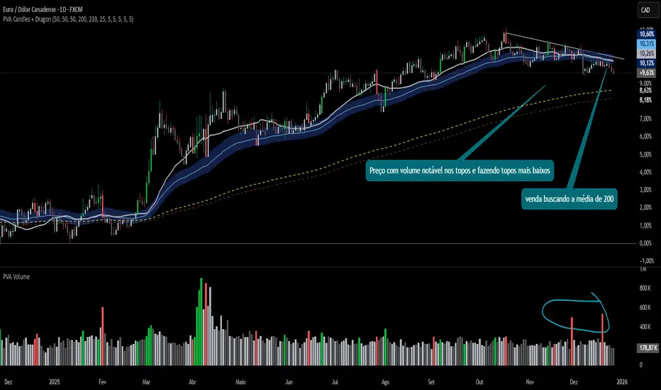 Acumulo de preço com volume notável nos topos. Quebra do dragão com vela de engolfo na direção da baixa. Existe uma boa probabilidade de o preço atingir a 200 EMA. Neste caso será um CT, pois o preço esta acima das médias de 200 e 233.