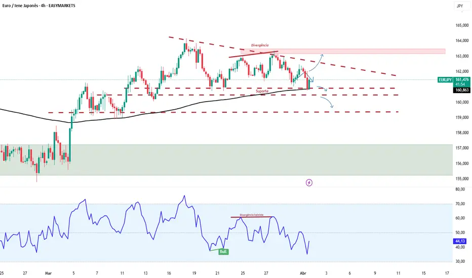 O preço do EUR/JPY está em uma tentativa de alta no timeframe de 4 horas, com um movimento ascendente indicado pela seta azul, testando a zona de resistência em 163,900. A Linha de Tendência de Baixa (LTB) tem atuado como suporte dinâmico, reforçando o viés baixista. No entanto, o RSI na parte inferior mostra uma divergência baixista, indicando um possível enfraquecimento da força compradora, o que aumenta a probabilidade de uma rejeição.