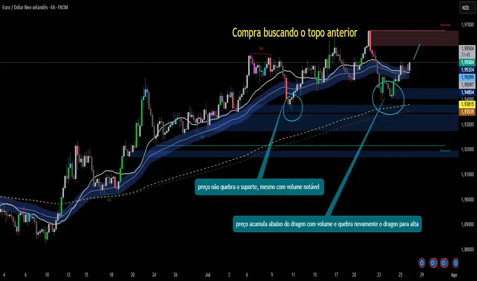 Preço acima da linha de base 200 EMA, indicando alta. O preço não quebra com volume notável o valor 1.94000 e faz um movimento de alta voltando acima do dragon. Os indicadores de tendência nos times H1, H4, D1 e W estão indicando compra forte.