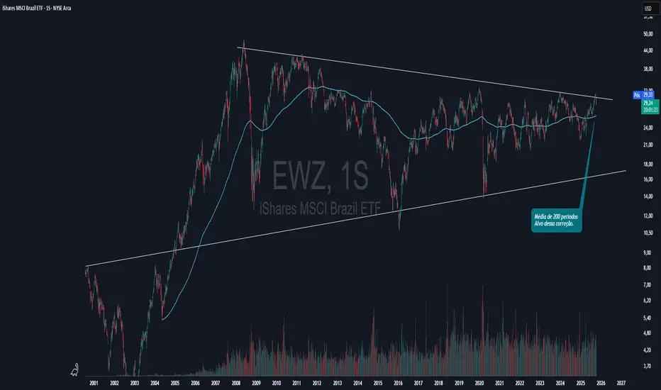 Pelo gráfico, o EWZ está formando uma espécie de triângulo simétrico, com diversos toques em suas linhas de tendência, o que indica um momento de consolidação antes de um possível movimento mais forte. Em caso de correção, um alvo importante é a média de 200 períodos, que pode atuar como suporte dinâmico.