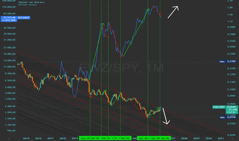 segue analise do gráfico principal saindo do canal de baixa que vinha desde 2011 nele mostra quando o mercado americano perde para os emergentes seguindo essa ideia ao observar o movimento do preço do BTC com esse gráfico notei uma certa confluência em suas pernadas de alta e correção o que indica que se o preço voltar pro canal BTC tende a superar os 200k e a farra dos emergentes terá se acabado porem se firmar o rompimento btc pode ter correções ainda mais pesadas