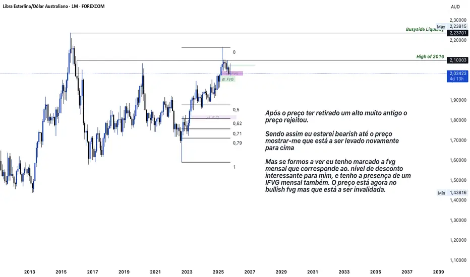 Mas se formos a ver eu tenho marcado a fvg mensal que corresponde ao. nível de desconto interessante para mim, e tenho a presença de um IFVG mensal também. O preço está agora no bullish fvg mas que está a ser invalidada.