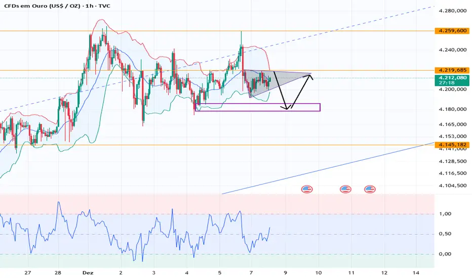 Observando o gráfico de 1 hora, o preço está a testar a borda superior de um padrão de triângulo. Esteja atento à continuação de curto prazo, com foco no nível de 4220. Uma quebra acima deste nível pode levar a uma subida adicional em direção a 4260, onde podem surgir oportunidades de compra. A estratégia de curto prazo continua a ser comprar em baixa e vender em alta.