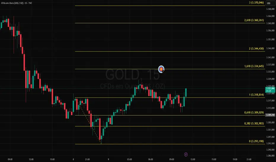 Rompeu a última pernada de baixa do GOLD 15M, não chegou em seu alvo, retraiu e poderá volta a subir até o seu alvo de Fibonacci.