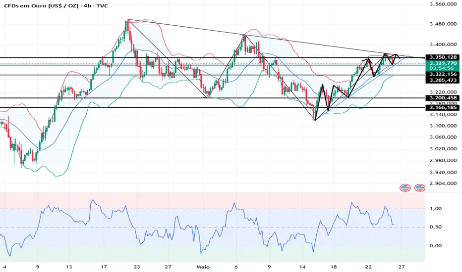 A resistência do gráfico de quatro horas é de 3350 e o suporte abaixo é de 3322
