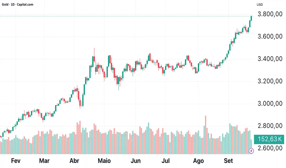 Gráfico de velas semanal (canto superior direito): O gráfico de velas semanal do ouro exibe uma tendência de alta bem estabelecida.