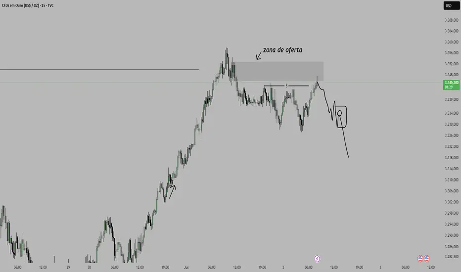 gold esta capturando liquidez de pequenos topos acima, pode entrar oferta e engatar dnv pra queda, vamos vender olhando pra pequena estrutura de baixa ao lado