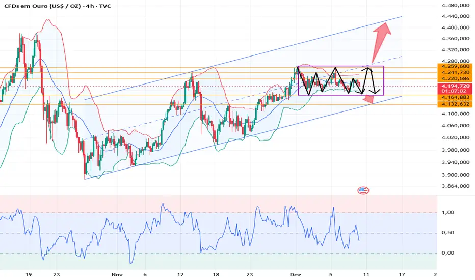 Analisando o gráfico de 1 hora, o preço está em tendência de queda, com quedas consecutivas no gráfico de velas. As médias móveis estão a cruzar para baixo. Note-se o suporte em torno de 4190, o mínimo da sessão anterior nos EUA. Uma quebra abaixo deste nível pode levar a um novo teste de 4160 a curto prazo.