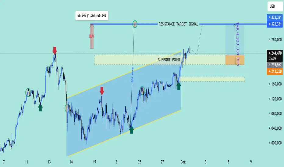 A linha azul marcada como TAR 4,323.331 representa o nível de resistência principal e, portanto, o alvo natural do movimento altista.