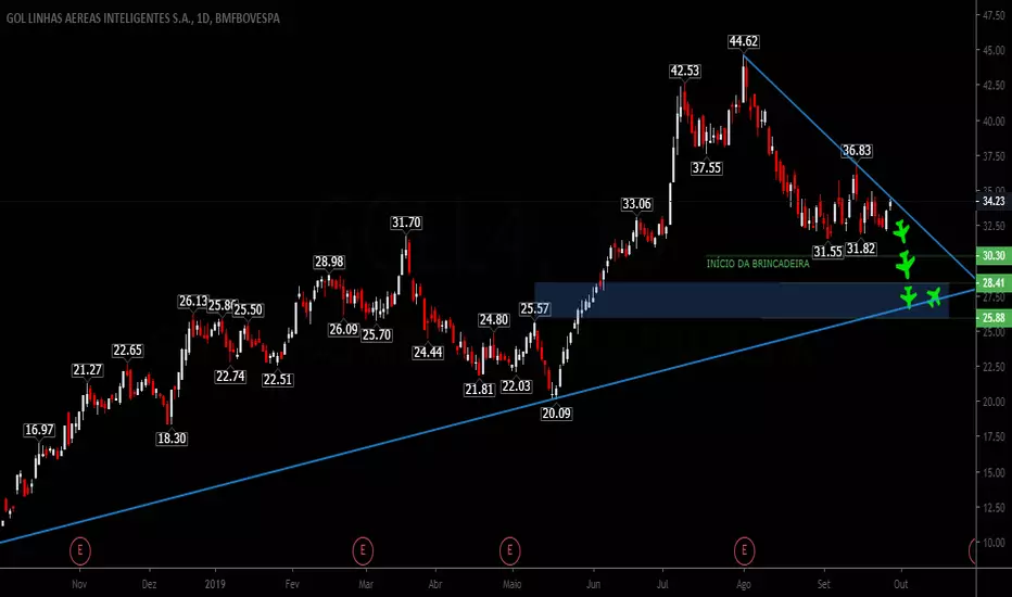 O gráfico segue com o primeiro GAP que deve acontecer na abertura por volta dos 30,30. Depois disso tem muito para cair até a zona retangular em destaque.