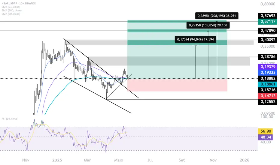 A partir deste gráfico já é possível tomar posições, tendo em vista um recuo para as faixas de 0,618 na retração de Fibonacci, sobre-venda no RSI e apoiado nas médias de 200 períodos, indicando um esgotamento na baixa do HBAR e fazendo pivô de alta e um engolfo de alta, indicando uma grande força relativa no preço do ativo.