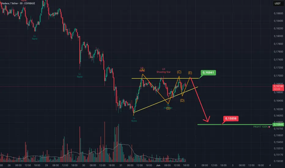 HBAR está fazendo uma formação de triangula ascendente caso confirme até onda E, o alvo de projeção será queda até 0,15. Lembrando que na onda E normalmente rompe para fora do triangulo capturando liquidez para voltar a seguir a sua queda. Vamos aguardar para ver se confirma.