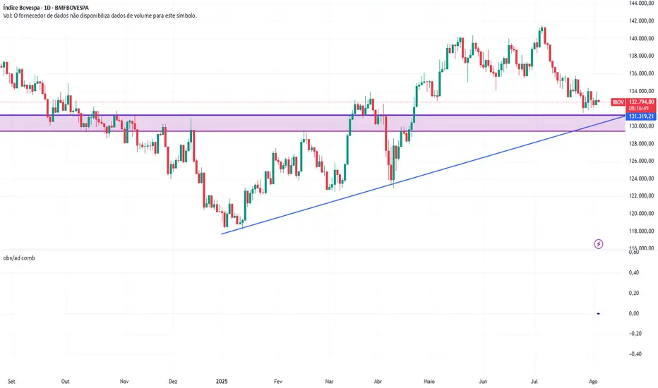 Para iniciar processo de compra no IBOV sugiro aguardar uma movimentação de queda na região de 131.300 a 129.400, região marcada pelo retângulo de cor violeta. A mesma zona favorece a confluência de uma linha de tendencia de alta que liga os fundos de janeiro e abril dede ano. A compra somente será acionada se houver reação de sinais de reversão com volume acima dos padrões atuais.