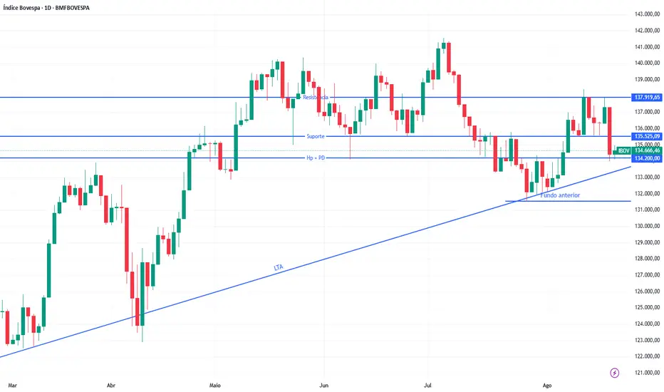 O Ibovespa fechou em alta de 0,17% aos 134.666 pontos e segue acima da LTA (Linha de Tendência de Alta) de médio prazo. O pregão foi marcado por movimento ameno de alta com baixo volume. Fundo anterior é marcado na região de 131.550. A região de 134.200 é marcada por historico de preço e patamar divisor da movimentação de alta. Caso haja rompimento de mínina no próximo pregão, sugere a continuaçao de queda ate a 131.950.