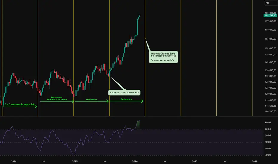 Caso o IBOVESPA mantenha esse padrão podemos esperar o final do Ciclo de Alta no final de Fevereiro ou começo de Março.