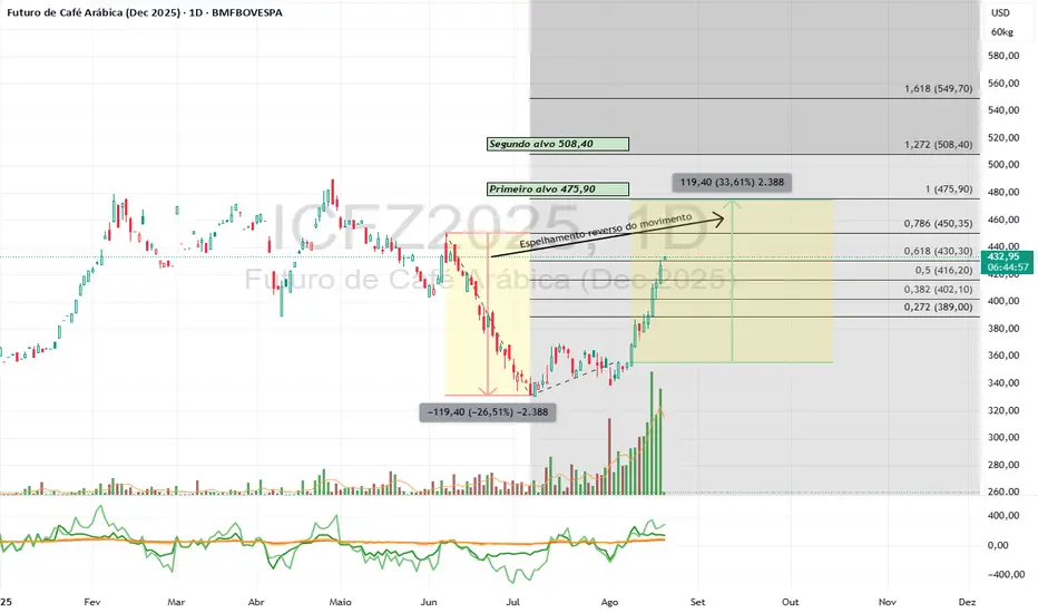 Café Futuro fez topo em 484,00 no dia 11/02/2025 e após uma correção até 321,00 no dia 08/07/2025 novamente toma tendencia de alta, mas agora com grande volume comprador com alvo final em 508,40