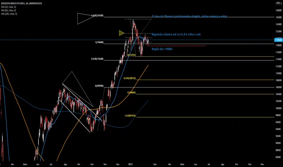 Após uma alta significativa, o índice está armando sinais de queda, ou uma correção. O índice atingiu o 3º alvo de Fibo que está desenhado e começou a cair chegando aos 114765 e regredindo até os 61,8 de Fibo, armando um possível pivô de baixa com alvos em 108135, 104040 e 97410, não vejo que o alvo atinja esse último devido, principalmente, à média de 200 que está chegando perto, ou até a de 80, que tem um certo peso. O ideal seria o rompimento e a confirmação desse grande pivô, porém, acredito que se perder a região dos 118800 o índice caia forte.