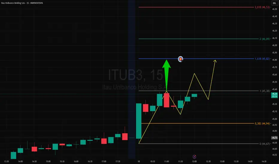 No gráfico de 5 minutos do ITUB3, rompeu um pivô de alta indicando a busca do(s) alvo(s) da projeção de Fibonacci, poderá retrair gerando um trade com retorno/risco mais favorável.
