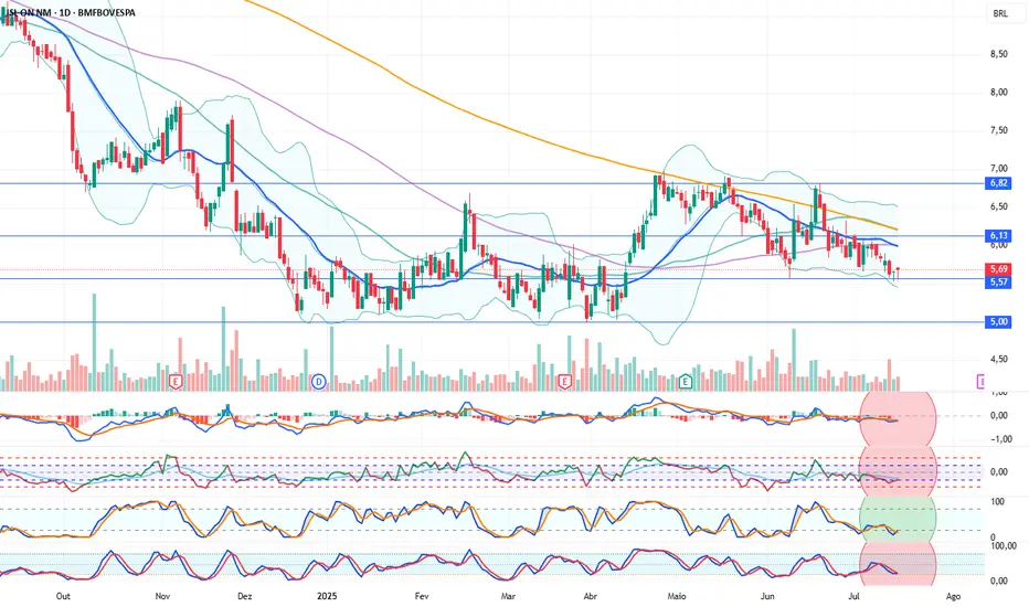 Os indicadores técnicos diários estão parcialmente positivos. A ação está estabilizada horizontalmente no nível de suporte de 5,57. Tendo formado suporte nesse nível anteriormente, veremos se a ação conseguirá iniciar um novo movimento de alta. O fato de os indicadores estarem em uma posição mais baixa pode criar a possibilidade de uma recuperação na ação. Encontrando-se logo abaixo das médias de preços de 200 e 21 dias (6,21 - 6,01), a ação, caso encontre suporte, pode criar a possibilidade de romper essas médias para cima. Posteriormente, há a chance de fortalecimento do suporte. A ação pode ter a oportunidade de testar novamente a resistência de 6,82.
