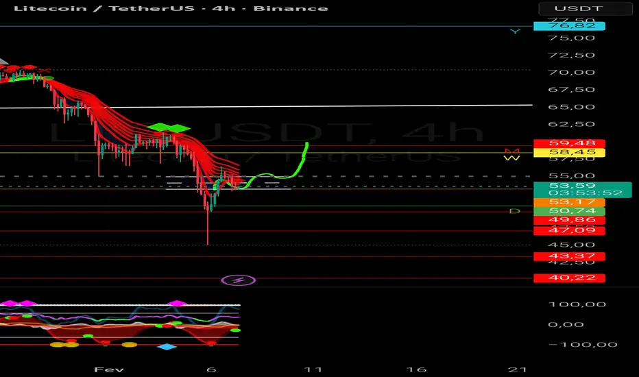 O Litecoin veio de uma queda forte e fez fundo ali na região dos 49–50.