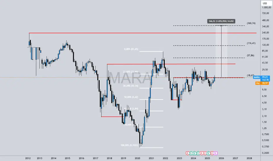 MARA (Marathon Digital Holdings) mostra estrutura de longo prazo com possível rompimento da resistência histórica na faixa dos 18,67 USD. Caso o rompimento se confirme, os alvos projetados por expansão de Fibonacci apontam para as seguintes zonas de preço: