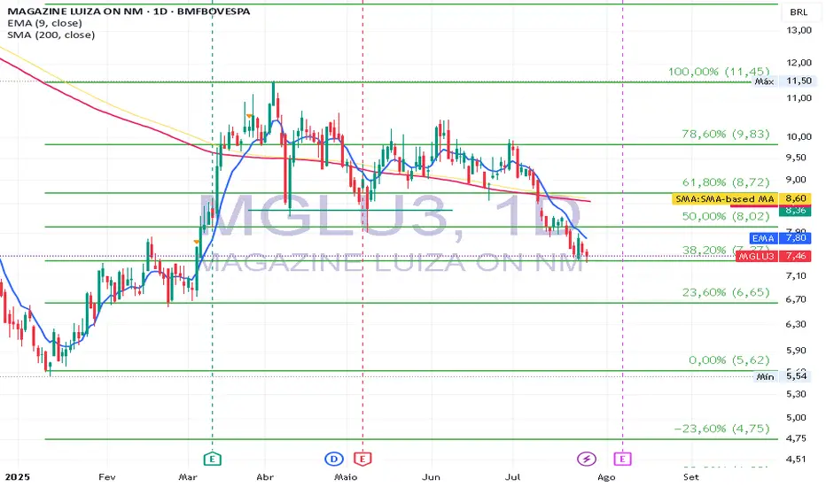 Fechamento acima de R$ 7,80 abre espaço para testes em R$ 8,20–8,50.