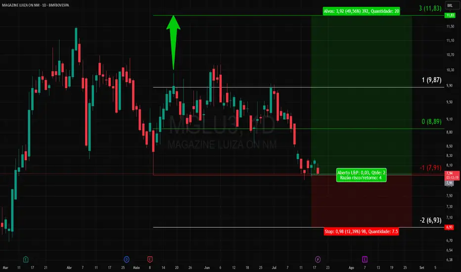 Podemos ter a alta de 50% no Magazine Luiza, a projeção é essa, rompeu a linha branca 1 indicando compra, pelo gráfico, deve ir pra cima, mas questões fundamentalistas também importam.