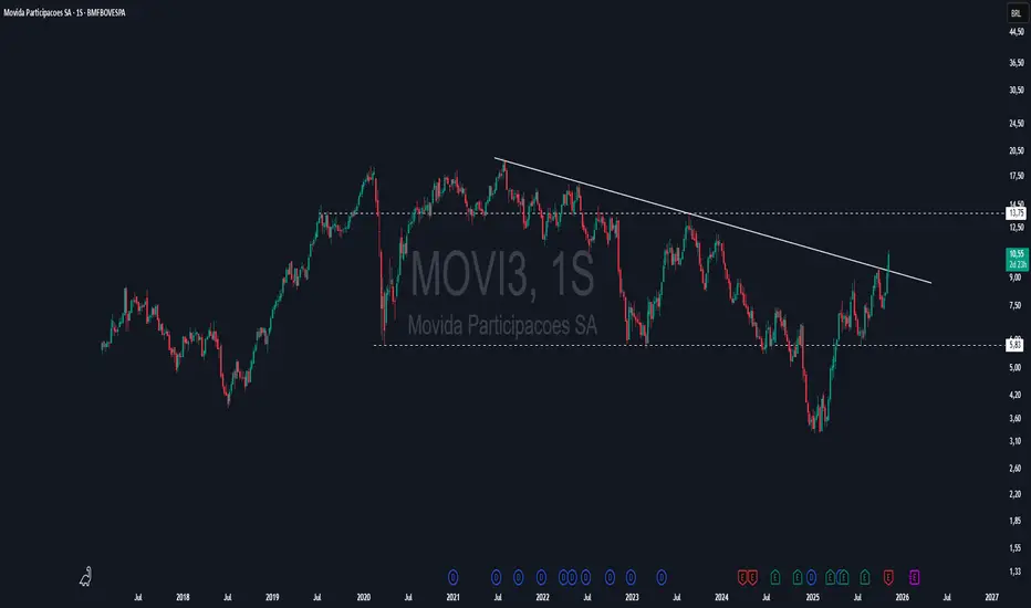 Pelo gráfico semanal, observa-se que o ativo da Movida está rompendo uma linha de tendência de baixa iniciada em julho de 2021. No entanto, como hoje ainda é terça-feira, o candle semanal ainda não está fechado, o que exige cautela na confirmação do movimento. Abaixo, em um gráfico também semanal, é possível identificar a formação de uma figura de ombro-cabeça-ombro. Embora o padrão pareça estar ligeiramente atrasado, já que o preço subiu consideravelmente após o rompimento da linha de pescoço, ao combinar essa leitura com o rompimento da tendência de baixa, há espaço técnico para uma continuidade de alta. O ativo encerrou o dia 11 de novembro cotado a R$10,55, e a próxima região de resistência relevante se encontra próxima a R$13,75, um pouco abaixo do alvo projetado pela figura.