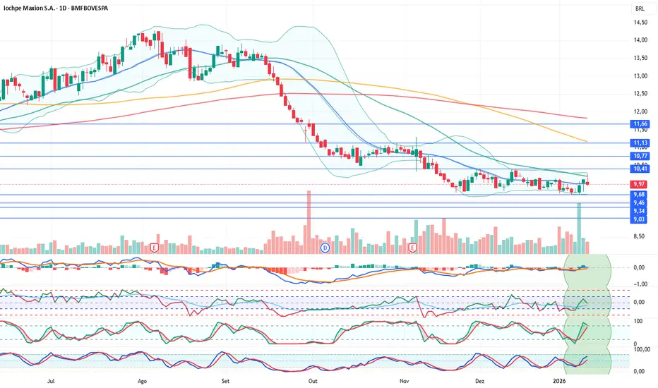 📊 Os indicadores técnicos diários estão positivos. A ação vem se movimentando há bastante tempo dentro de uma faixa de preço definida (9,68 – 10,41). Com os indicadores em território positivo, acreditamos que o suporte para a ação possa se fortalecer. Além disso, no cenário técnico semanal, o preço segue lateralizado no nível de suporte de 9,68. Com os indicadores semanais também apresentando sinais positivos, existe a possibilidade de fortalecimento desse suporte.
