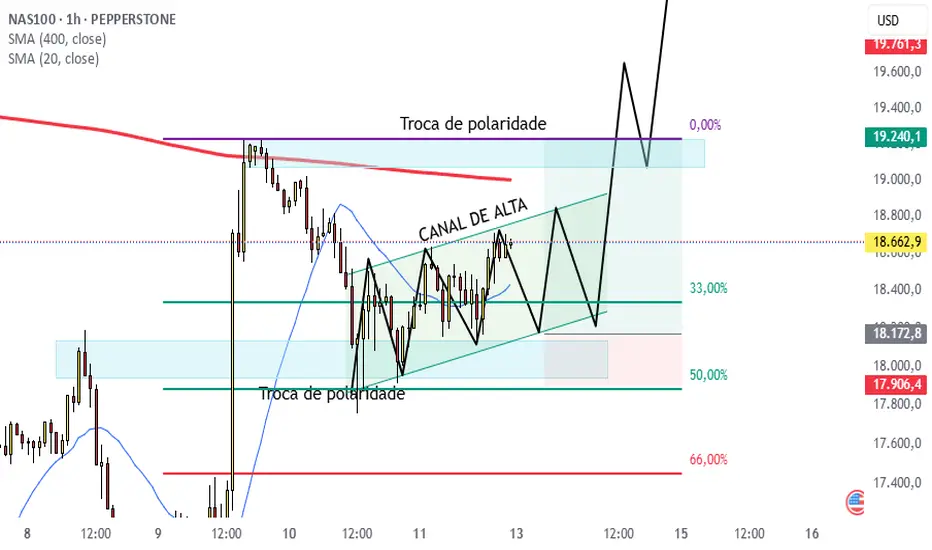Nasdaq segue respeitando um canal de alta bem estruturado, com o preço oscilando entre topos e fundos ascendentes após uma importante troca de polaridade.