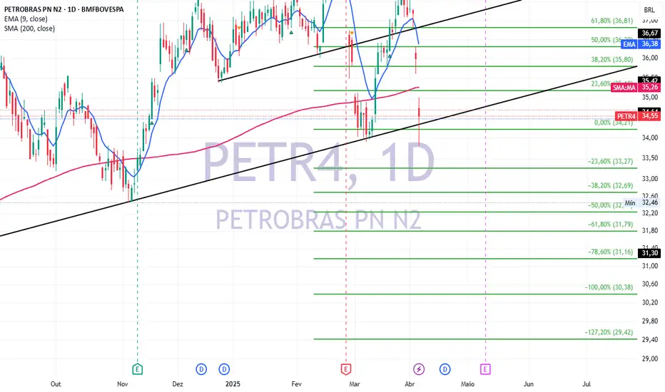 O momento atual para PETR4 é de altíssimo risco, conforme apontado na análise inicial. A indefinição gráfica, somada às incertezas macroeconômicas relacionadas às tarifas de Trump e à volatilidade do preço do petróleo, exigem extrema cautela por parte dos investidores. A confirmação da perda da região de R$ 34,00 pode abrir espaço para quedas expressivas, enquanto a manutenção do suporte e o surgimento de sinais técnicos de reversão poderiam indicar uma retomada da tendência de alta. Acompanhamento rigoroso dos indicadores técnicos e dos desenvolvimentos no cenário macroeconômico é fundamental para a tomada de decisões estratégicas.
