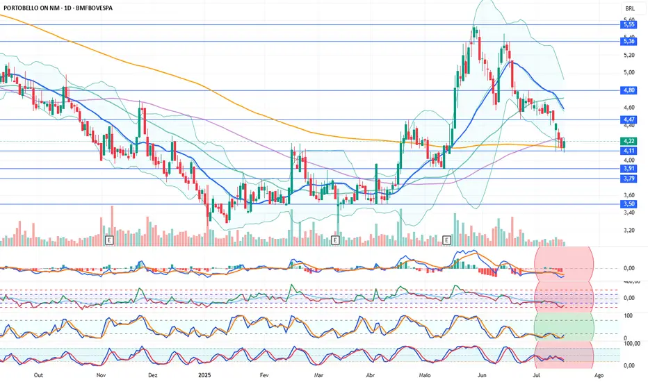 s indicadores técnicos diários estão negativos. A ação caiu até a média de preços de 200 dias (4,14), encontrando-se atualmente no nível de suporte de 4,11. Caso não haja compras de reação a partir desses níveis, o suporte de 3,91 será monitorado nos níveis mais baixos. Os indicadores continuam negativos em uma posição mais baixa. As compras de reação determinarão a direção da ação.