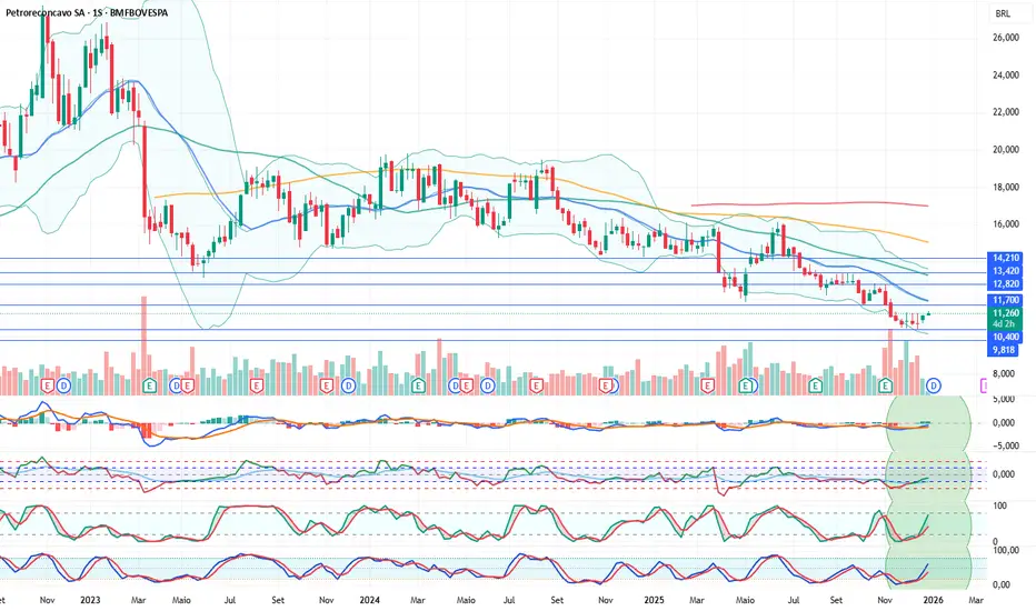 Os indicadores técnicos semanais seguem com viés positivo. Após se movimentar de forma lateral no nível de suporte em 10,40, a ação aparenta ter iniciado uma tendência de alta. O fato de os indicadores começarem a apresentar sinais positivos, partindo de níveis mais baixos, pode indicar um possível potencial de valorização do ativo. Caso a ação rompa para cima a média móvel de 21 dias (11,955), a probabilidade de fortalecimento do suporte pode aumentar. Mesmo estando muito abaixo da média móvel de 200 dias (17,055), consideramos a possibilidade de um movimento de alta.