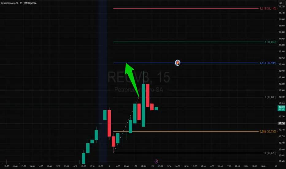No gráfico de 5 minutos da RECV3, rompeu um pivô de alta indicando a busca do(s) alvo(s) da projeção de Fibonacci, poderá retrair gerando um trade com retorno/risco mais favorável.