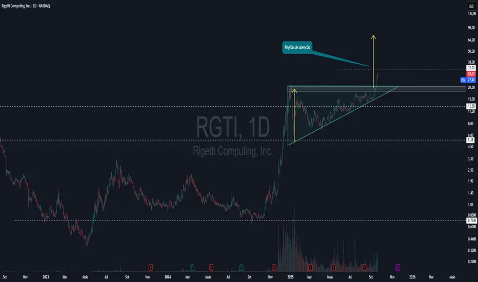 No gráfico diário, a movimentação da RGTI formou uma figura de triângulo ascendente, caracterizada por uma linha de resistência horizontal e fundos ascendentes. Esse padrão geralmente indica uma pressão compradora crescente e, se rompido para cima, pode sinalizar continuidade da alta. Aguardar um pullback após o rompimento pode ser uma alternativa mais prudente, mas caso haja força compradora suficiente, o ativo pode seguir sem correção mais profunda.
