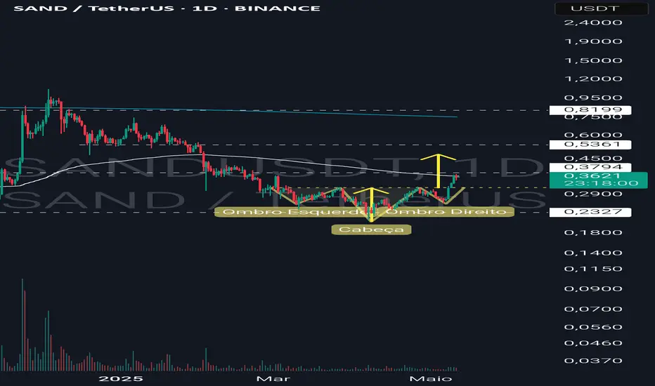 O ativo SANDUSDT vem de uma tendência de baixa acentuada iniciada em dezembro de 2024, acumulando uma desvalorização superior a 70%. Após esse movimento, o preço parece ter formado, no gráfico diário, uma figura clássica de reversão de tendência: a Cabeça e Ombros. A linha de pescoço (neckline) dessa formação está na região dos 0,31 centavos de dólar, onde o ativo começa a mostrar reação.