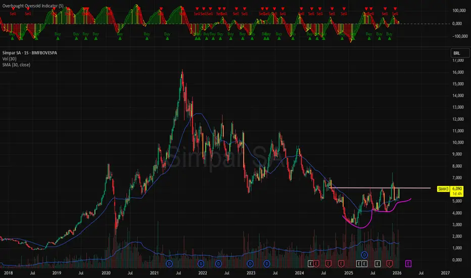 Simpar SIMH3 com fundos ascedentes, contração de volatilidade, preço num range apertado, pronto pra romper uma zona de resistência.