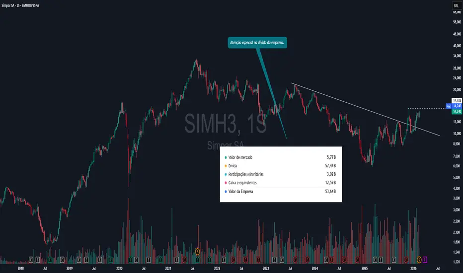 No gráfico semanal, SIMH3 vem de uma tendência de baixa iniciada em julho de 2023, com inclinação moderada. Houve uma tentativa de rompimento da linha de tendência em novembro de 2025, mas o movimento encontrou resistência na região de R$14,90 e perdeu força. O candle mais recente mostra reação compradora e quase envolve o anterior, mas ainda depende de confirmação.