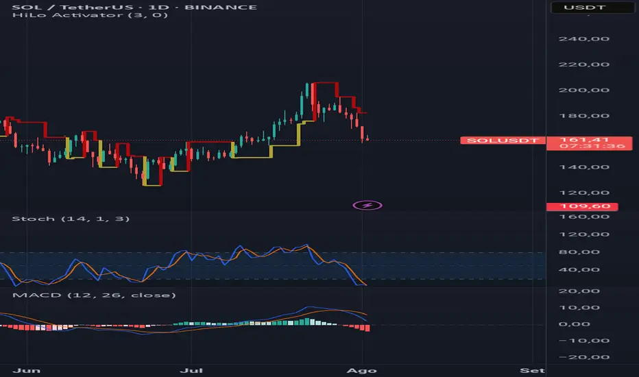 Com base no gráfico diário (1D) do par SOL/USDT, vamos analisar os principais indicadores técnicos visíveis: HiLo Activator, Estocástico, e MACD, para responder se é hora de entrar, esperar ou operar vendido com stop curto.