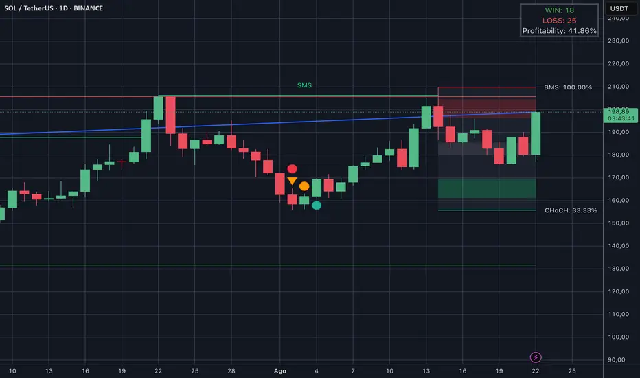 A região próxima aos 200–210 USDT foi marcada como área de resistência (em vermelho). Isso significa que o preço já encontrou vendedores fortes nesse ponto anteriormente.
