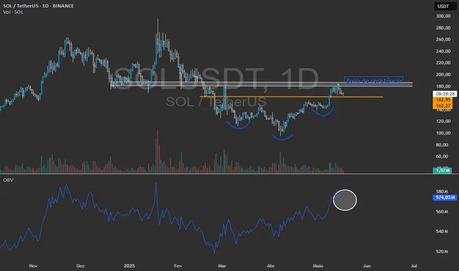 Após um OCO inverso (ombro-cabeça-ombro) que gera uma subida, Solana toca na resistência e volta para o nível mais próximo do suporte.