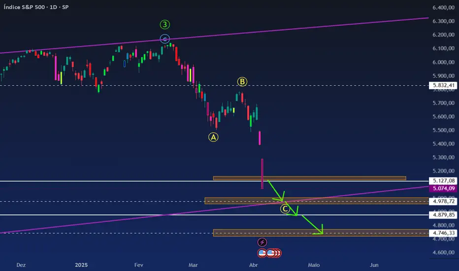 Alvos de Fibo para esse movimento de crash. As tarifas derrubaram o mercado e Trump permanece irredutível até o momento que escrevo essas palavras. Não acredito em quedas muito piores do que estas dos alvos. Isso é diferente de dizer que eleas não podem acontecer. Tudo pode. Mas os meus alvos são esses desenhados. Provavelmente mais uma semaninha aí de pânico seguido de recuperação da bolsa.