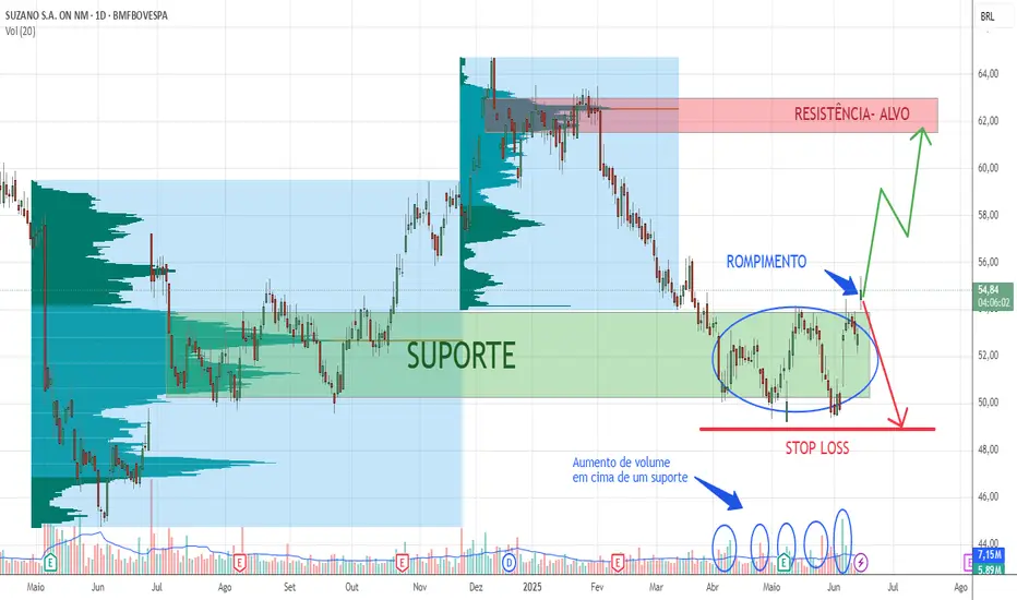 Após um movimento de baixa, SUZB3 encontrou suporte em uma região de forte concentração de volume, revelada pelo volume profile — essa área foi formada ao longo de aproximadamente 4 meses, marcada com o retângulo verde. Essa região também é considerada um padrão de acumulação de acordo com teoria e Wyckoff, servindo atualmente como suporte.