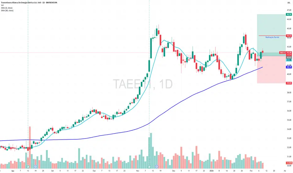 Entrada R$ 42,00; Realização Parcial R$ 44,22 e alvo final em R$ 46,56. Caso o trade não ande conforme o programado o stop loss deve ser posicionado em R$ 39,05.