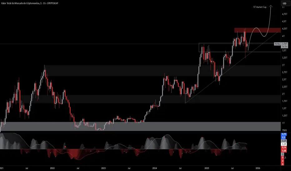 Devemos ter uma alta segmentada até os US$ 5T de Market Cap total, com certeza com #BTC e #ETH subindo meio a isso, podendo até buscar novas ATH's, mas impulsionando principalmente Altcoins, que devem retornar a bons valores pra quem tem um preço médio de compra / DCA, nessas zonas mais baixas.