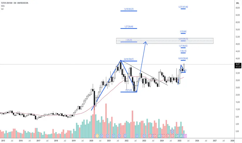 tots3 chama atenção pelo gráfico mensal após ter rompido uma LTB ainda no final de 2023 e mais recentemente ter iniciado um pivô de alta cujo primeiro alvo se dará na região dos 43,13 e alvo final na região dos 49,20, alvo este de movimento maior.